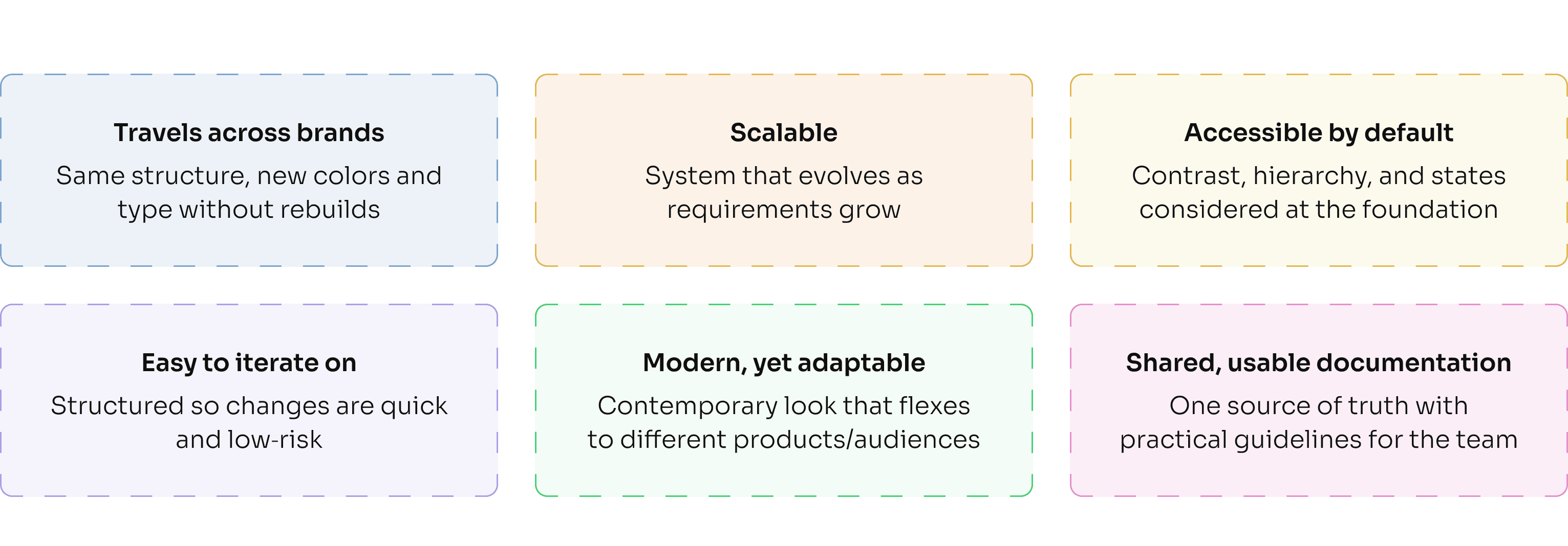 Before I could focus on visual execution, I needed a plan of action. To move from bespoke UI kits to a proper, reusable design system, I started by mapping what 'good' should look like for our context: